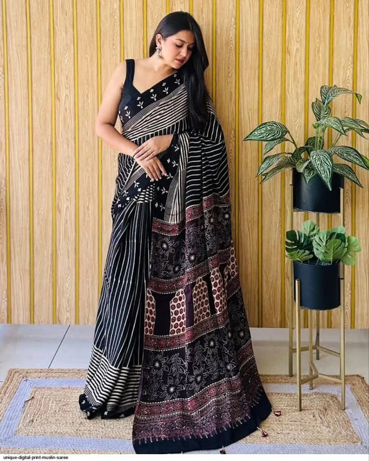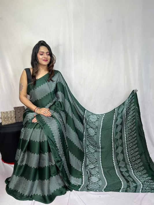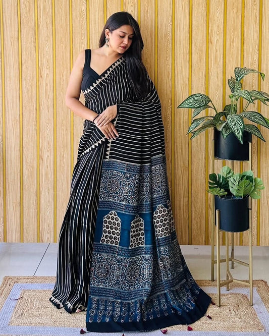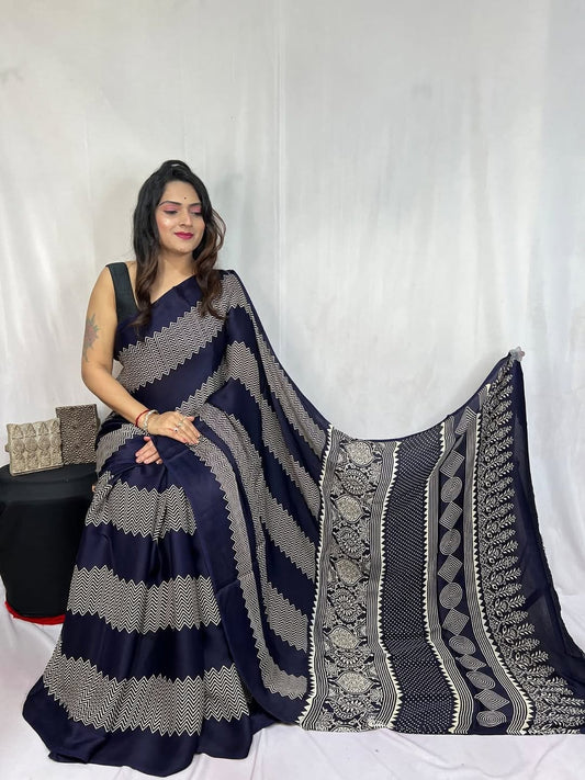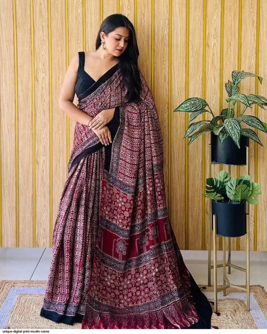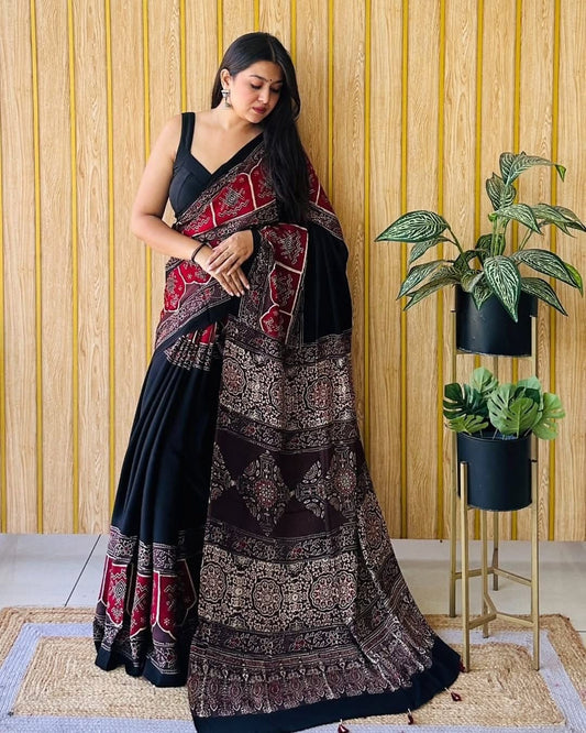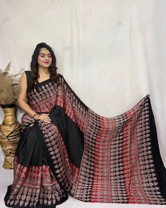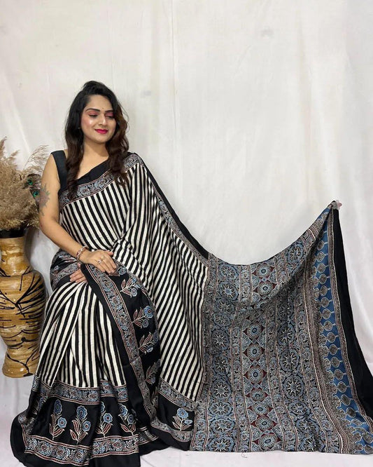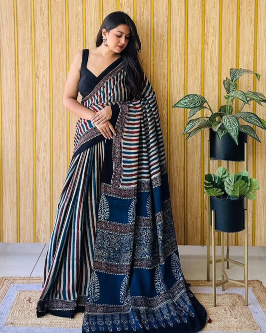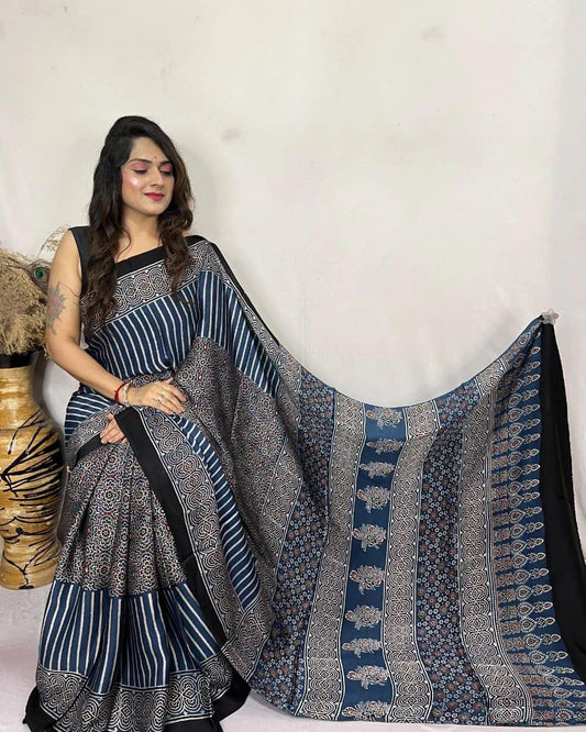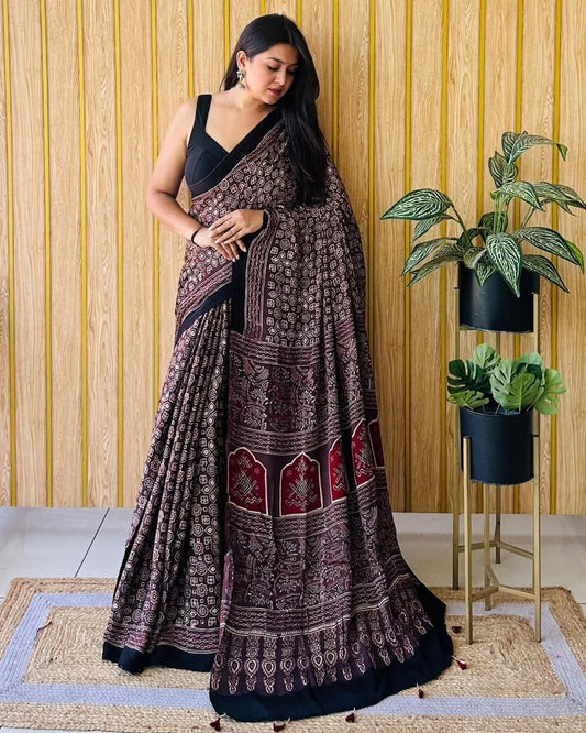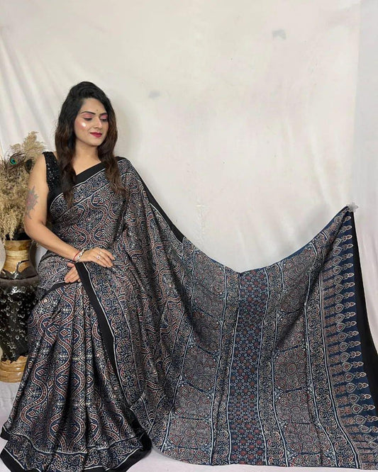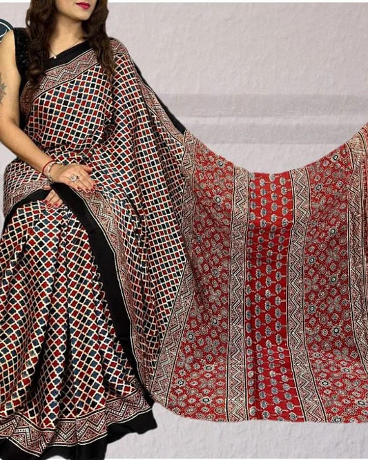 New Ajrakh Semi Gaji Silk Ajrakh Fancy Pallu Saree Available in semi gaji silk ajrakh...