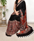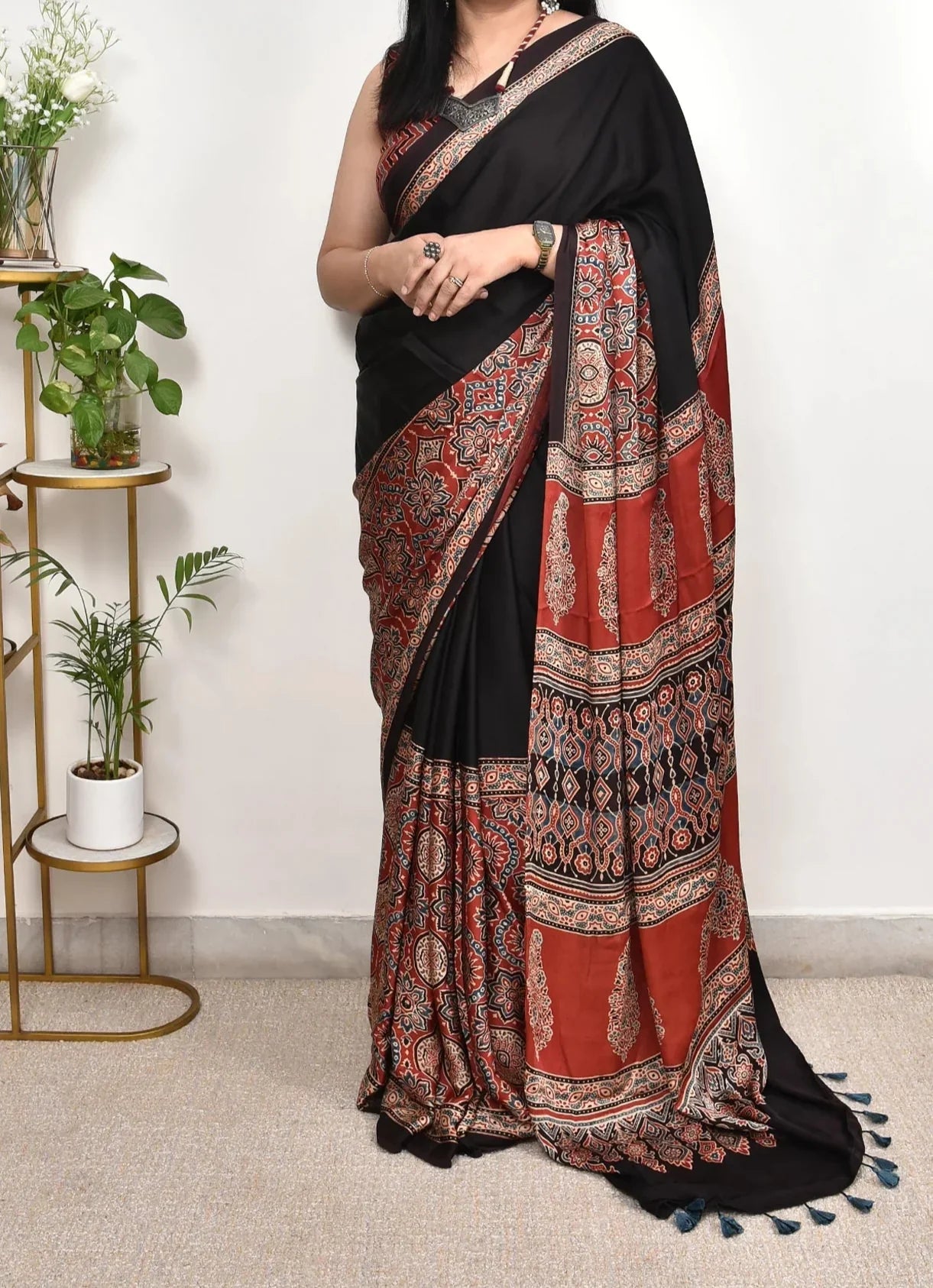 Saree work : Digital Print Border with Ajrakh Rich Pallu With Contrast Blouse