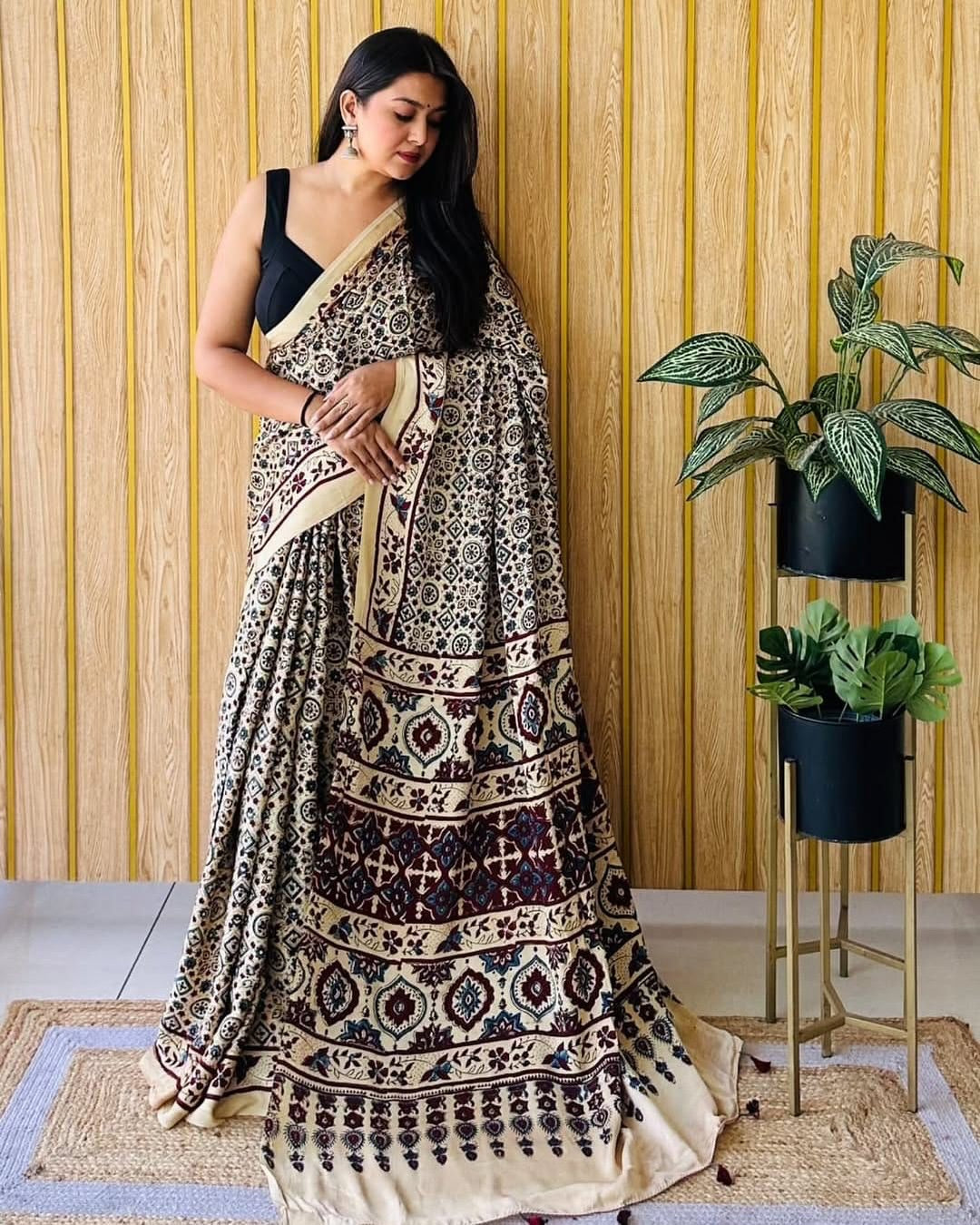 Available in semi gaji silk ajrakh natural digital print saree with ajrakh and fancy ajrakh pallu saree Same fabric Ajrakh blouse.