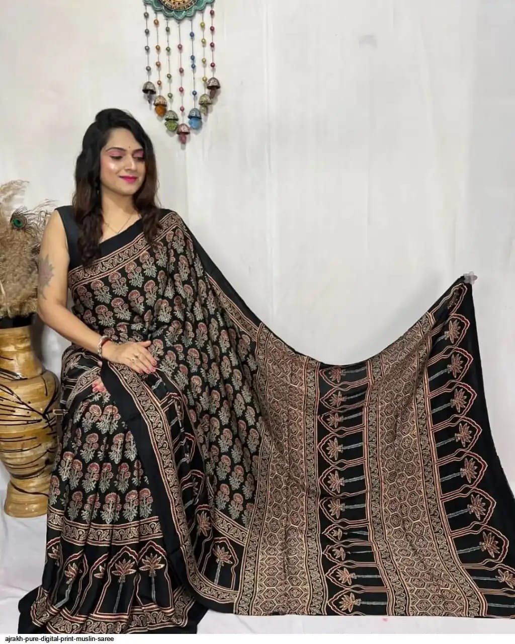 Available in semi gaji silk ajrakh natural digital print saree with ajrakh and fancy ajrakh pallu saree Same fabric Ajrakh blouse.