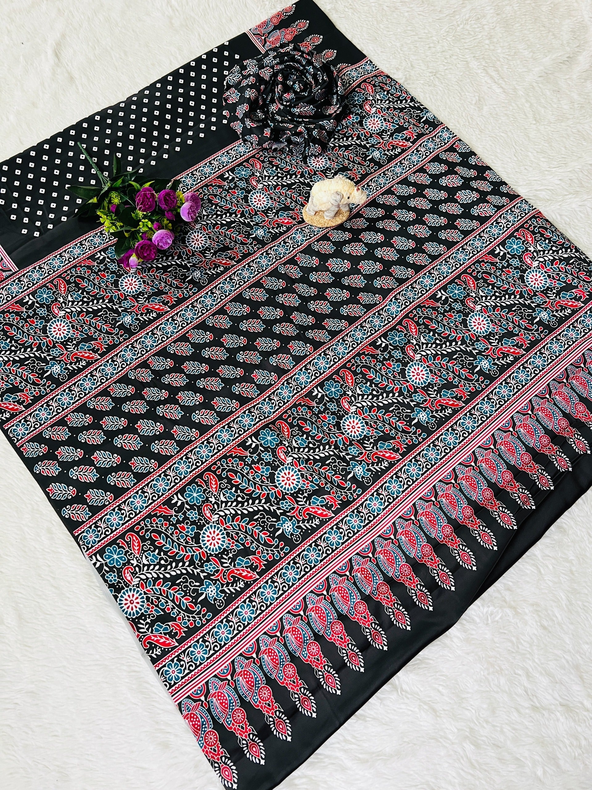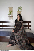Saree work : Digital Print Border with Ajrakh Rich Pallu With Contrast Blouse