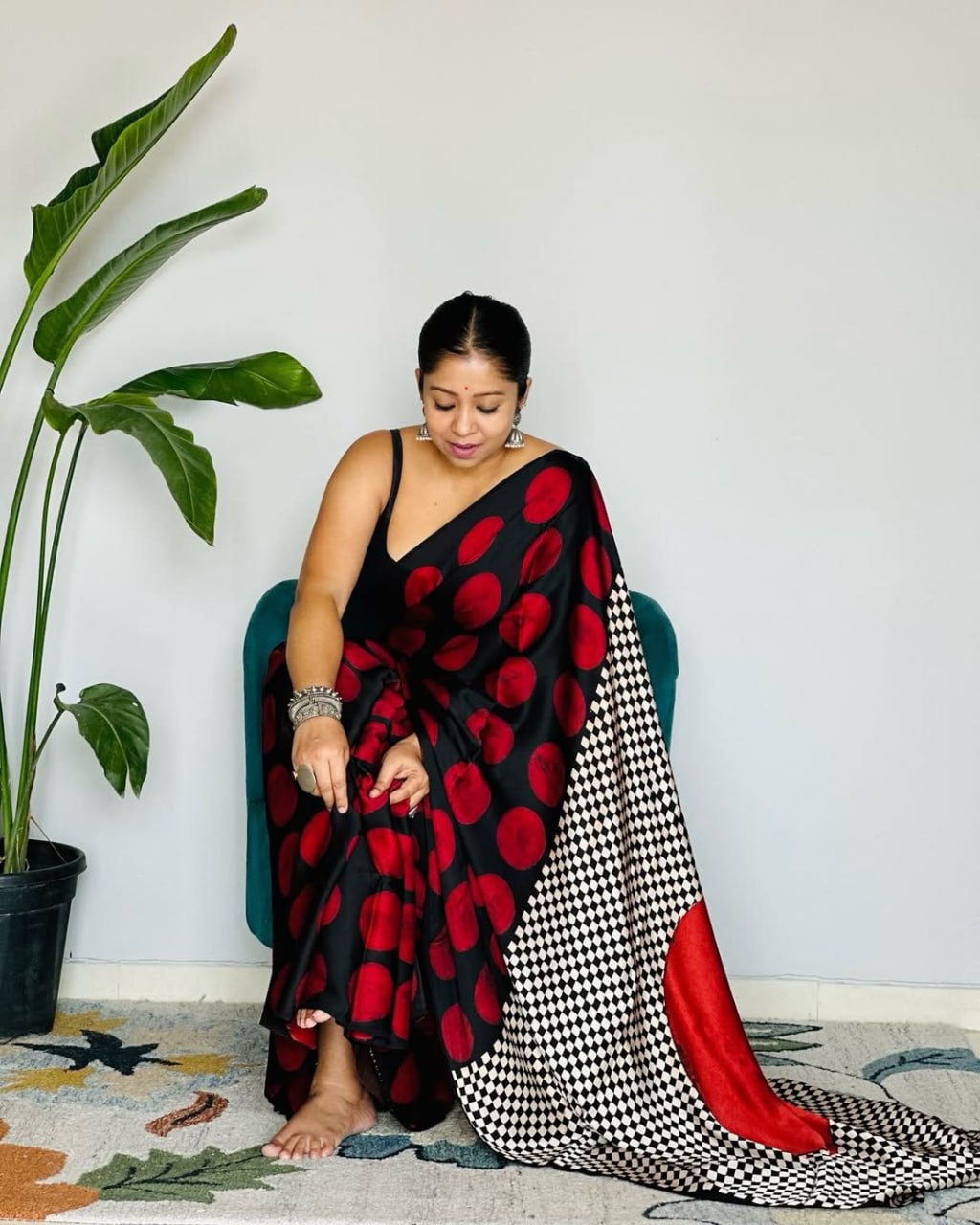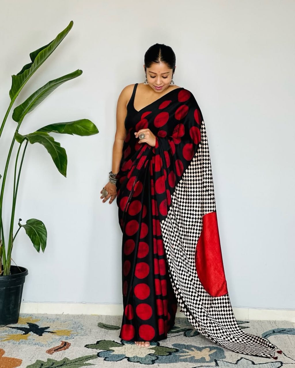 Saree work : Digital Print Border with Ajrakh Rich Pallu With Contrast Blouse