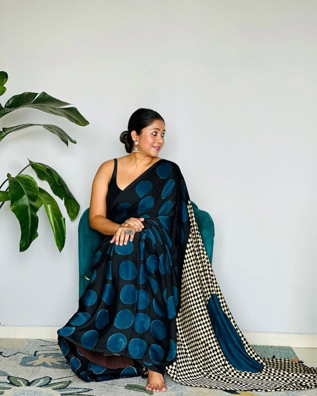 Saree work : Digital Print Border with Ajrakh Rich Pallu With Contrast Blouse